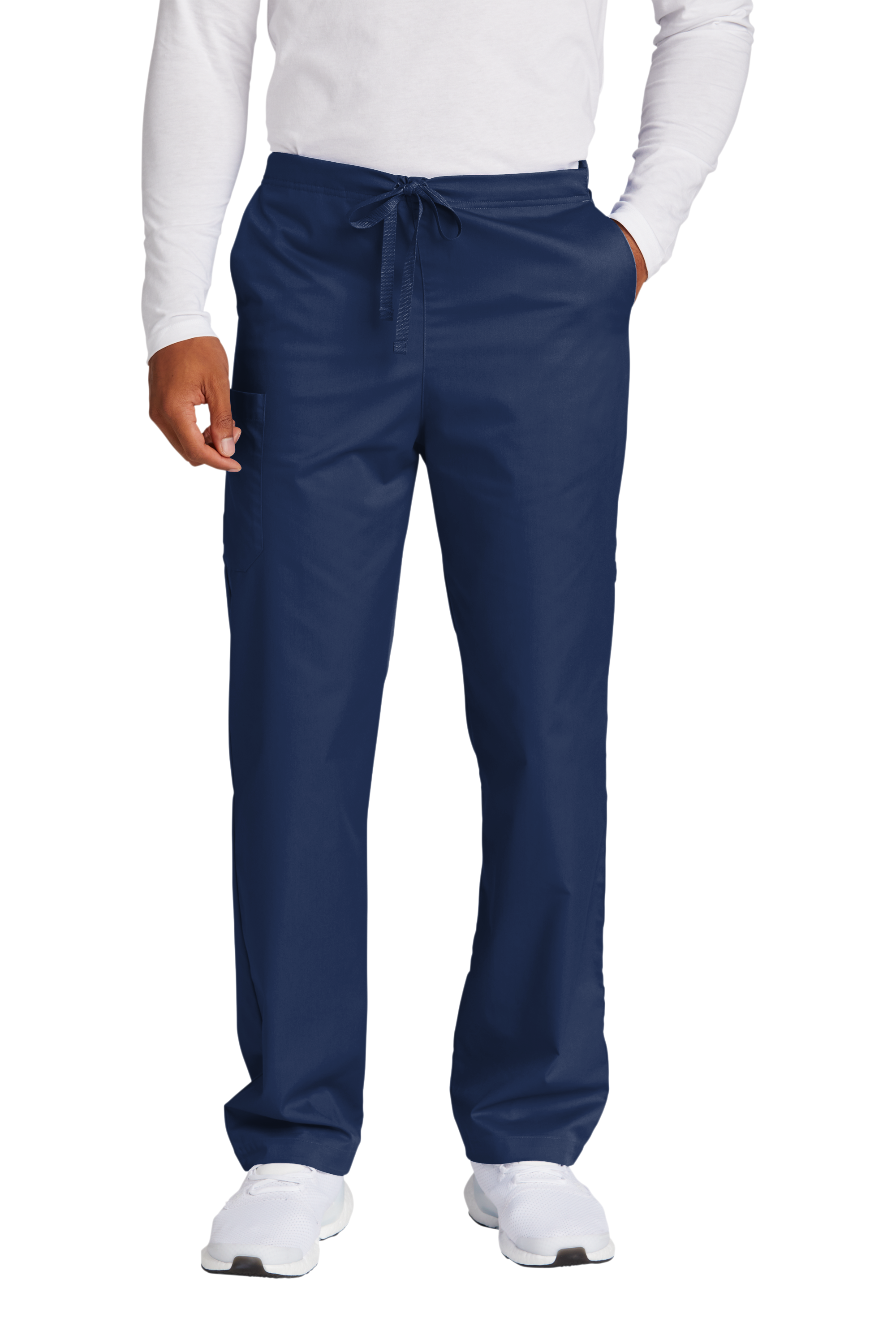 - Flat front full drawstring and half-back elastic waistband